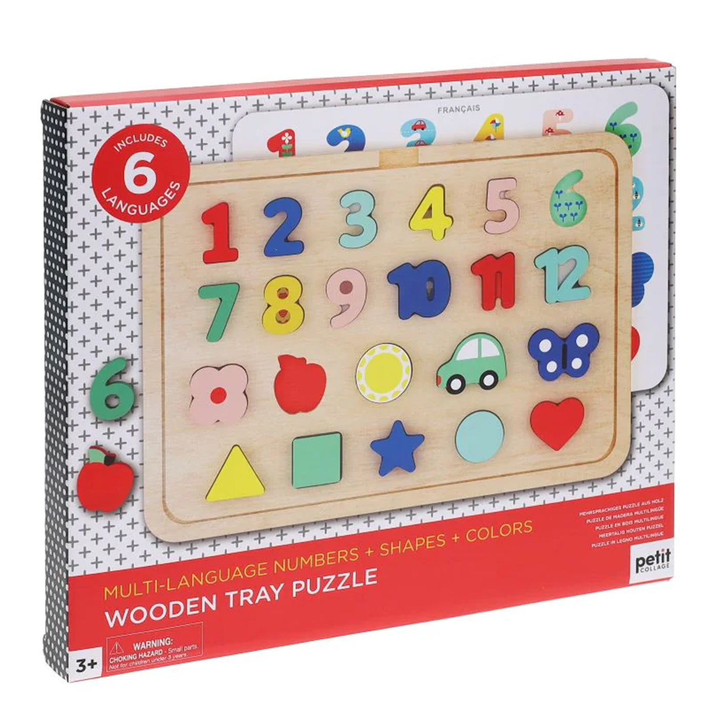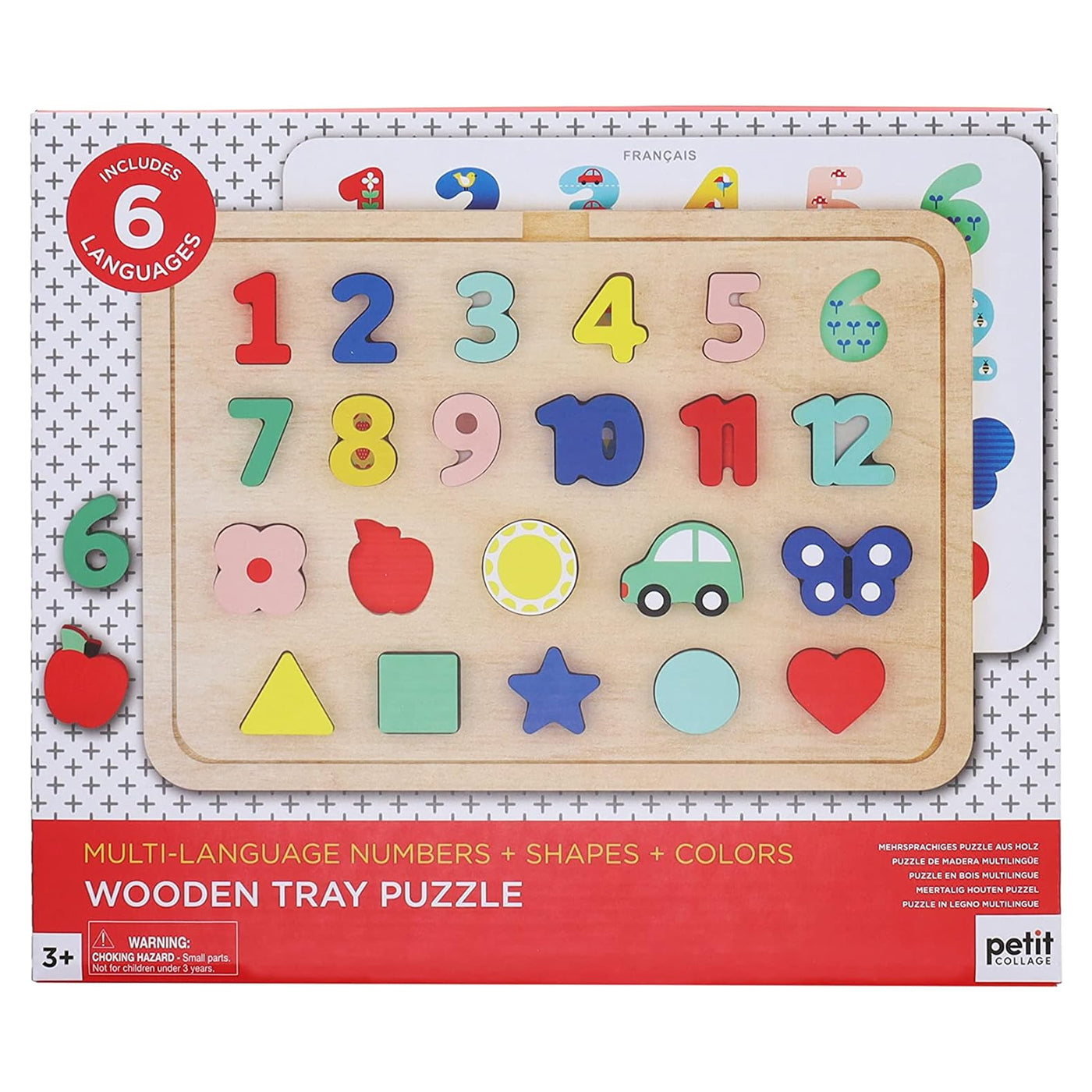 Çocuklar, Petit Collage'ın bu çok dilli yapbozu ile 6 farklı dilde sayıları, şekilleri ve renkleri öğrenebilir! Ahşap yapboz, dil bilgisinin, ince motor becerilerinin, el-göz koordinasyonunun, sayı, şekil ve renk tanımanın ve el becerisinin geliştirilmesine yardımcı olur. İngilizce, İspanyolca, Fransızca, Almanca, Felemenkçe ve İtalyanca öğrenmek için 12 büyük ahşap sayı, 10 ahşap şekil ve 3 çift taraflı dil sayfası içerir. Dili değiştirmek için üstteki bulmacayı kaldırmanız yeterli.