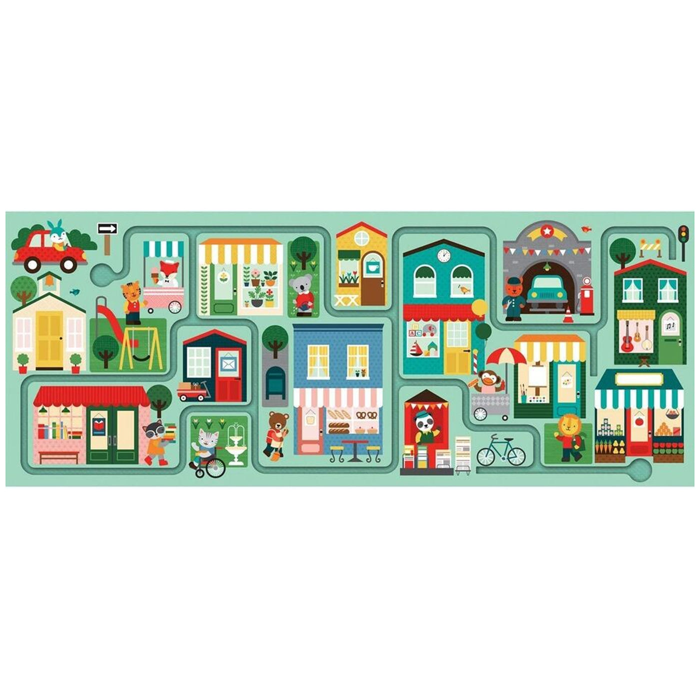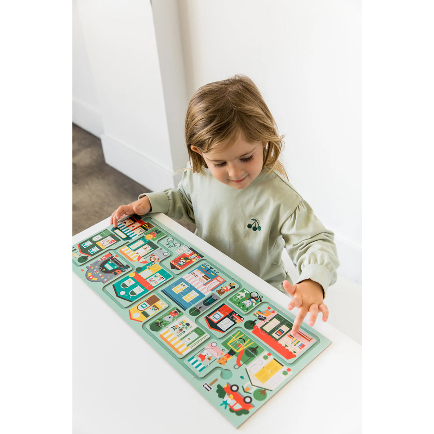 Çocuklar, şehir temalı 10 parçalı büyük yapbozu tamamladıktan sonra girintili labirenti parmaklarıyla takip ederek yol boyunca 20 farklı öğeyi görmeye çalışacak.