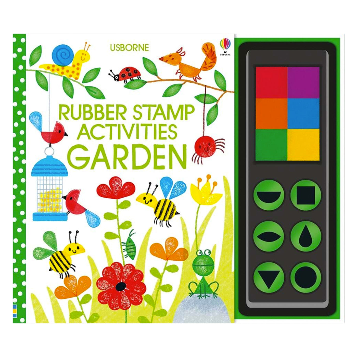 Kitap, altı adet renkli mürekkep süngerine ve 6 adet geometrik şekilli kauçuk damgaya sahip.