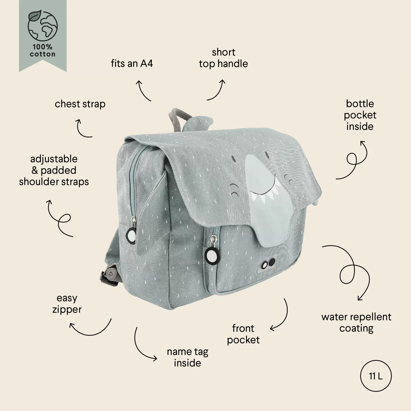 Bu sevimli sırt çantası ile çocuğunuz herhangi bir maceraya veya okula ilk seyahatine tamamen hazır! Sırt çantası, ayarlanabilir ve dolgulu omuz askılarına ve gittiğiniz her yerde kolayca tutup asmak için üstte kısa bir tutamağa sahiptir. Göğüs kemeri, omuz askılarının aşağı düşmesini önler. Sırt çantasının büyük bir bölmesi ve küçük bir ön cebi vardır, burada küçük bir aperatifi güzelce saklayabilirsiniz. Ana ve ön cepte, çocukların sırt çantasını kolayca açıp kapatmalarını sağlayan bir fermuar bulunur. Seyahat arkadaşınızı kaybetmemeniz için çantanın iç kısmında isim etiketi bulunmaktadır. Ayrıca sırt çantası su tutmaz ve çamaşır makinesinde hafif durulama ile yıkanabilir. Ancak, çantayı ne kadar çok yıkarsanız, o kadar az su itici olacağını unutmayın.