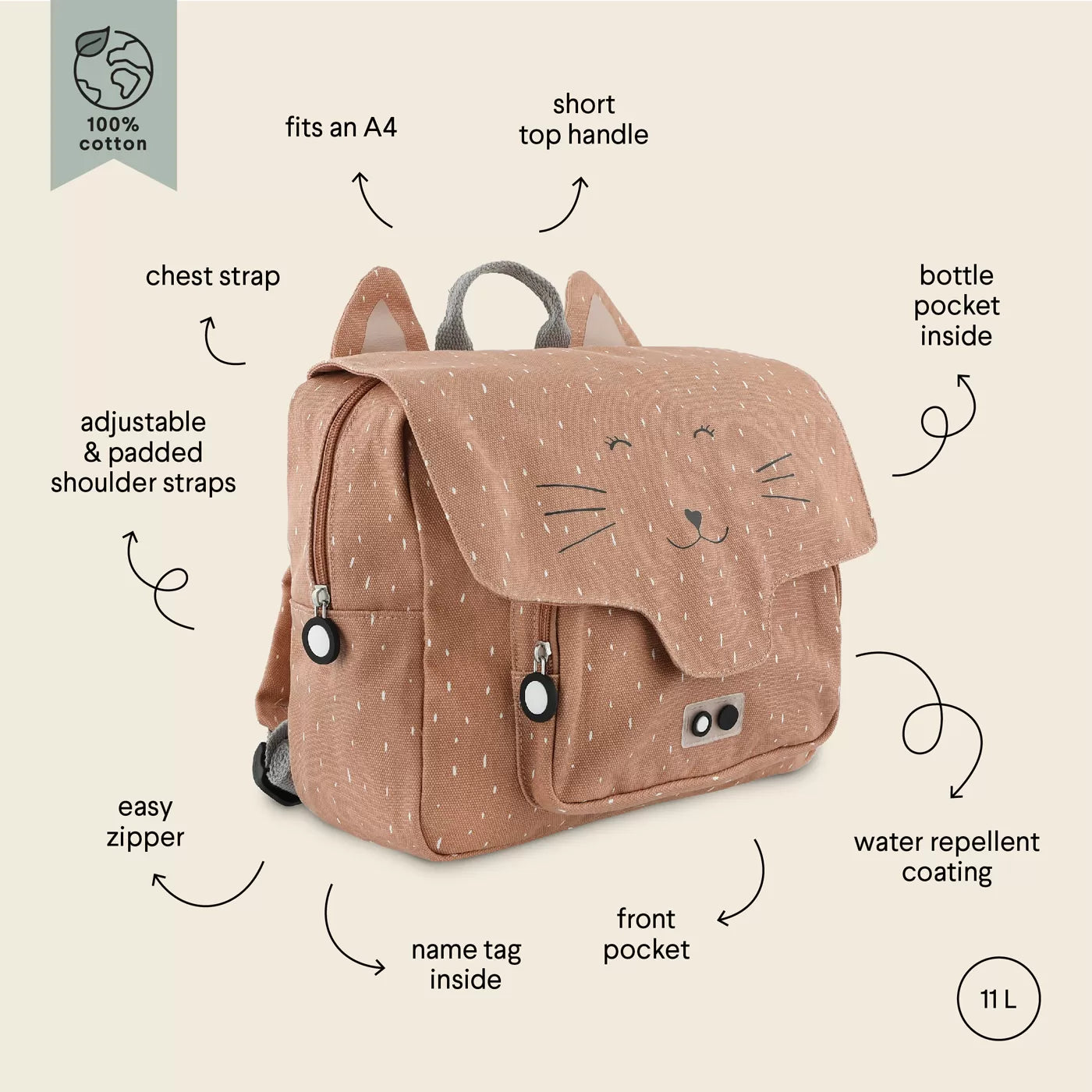 Bu sevimli sırt çantası ile çocuğunuz herhangi bir maceraya veya okula ilk seyahatine tamamen hazır! Sırt çantası, ayarlanabilir ve dolgulu omuz askılarına ve gittiğiniz her yerde kolayca tutup asmak için üstte kısa bir tutamağa sahiptir. Göğüs kemeri, omuz askılarının aşağı düşmesini önler. Sırt çantasının büyük bir bölmesi ve küçük bir ön cebi vardır, burada küçük bir aperatifi güzelce saklayabilirsiniz. Ana ve ön cepte, çocukların sırt çantasını kolayca açıp kapatmalarını sağlayan bir fermuar bulunur. Seyahat arkadaşınızı kaybetmemeniz için çantanın iç kısmında isim etiketi bulunmaktadır. Ayrıca sırt çantası su tutmaz ve çamaşır makinesinde hafif durulama ile yıkanabilir. Ancak, çantayı ne kadar çok yıkarsanız, o kadar az su itici olacağını unutmayın.